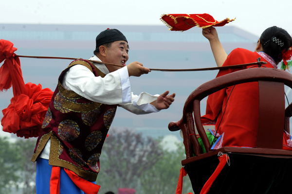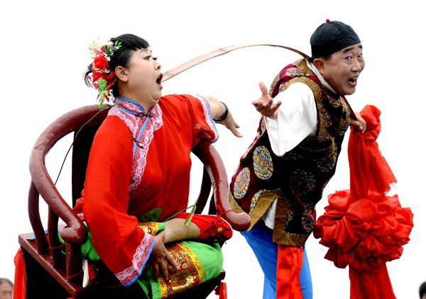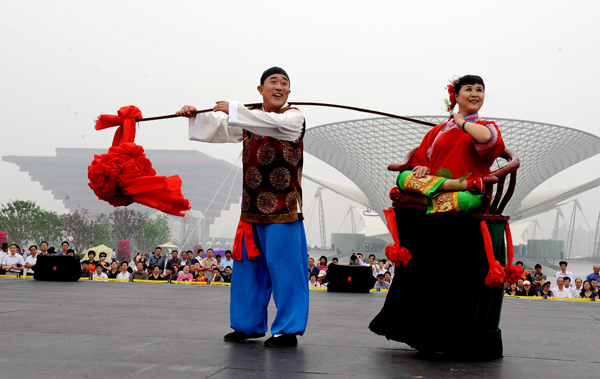 5月20日,山西省孝义市的两位民间演员在世博园庆典广场表演秧歌《回娘家》。两位演员极具地方特色的精彩表演赢得了观众的喝彩。