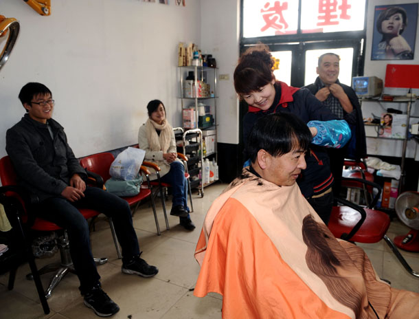 2012年2月23日,在太原市的一家理发店内,市民们正在理发