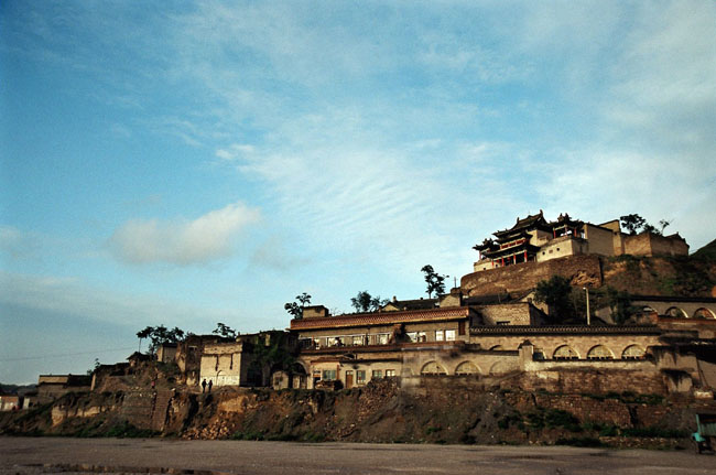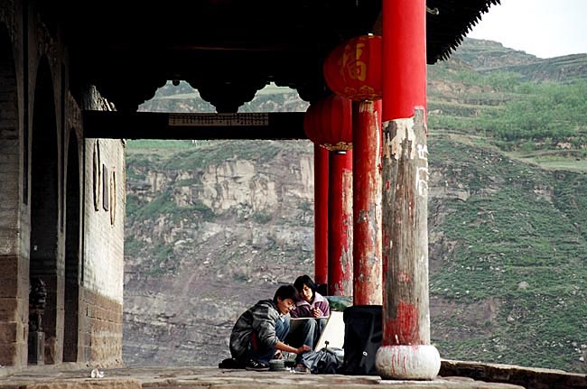 其实,来这碛口黑龙庙还真不用寻。从太原就有来碛口的长途班车。帐单如下;太原到碛口35元/人.住碛运宾馆每人(负三星级的,别吓着你.但房内有电视,还干净,夜里得带手电下楼穿坪院去“卫生间”)15元/天.包吃住。那么住两宿,往返三天吧!算算,正好一百元呐!呵呵,而今随便在哪个都市揣着一百元上饭馆,用王朔的话说,你是铁定要“自卑”的。费用如此低廉的三天行旅,你倒是上哪儿找去?更大的优点是,至少眼下碛口还没来打小旗儿的团队,只是隔三差五的来了一两帮学画的孩子们,依在庙门下涂着抹着,我倒觉得,那反而是为这三百年的古庙,添了一道靓丽青春的风景哩!