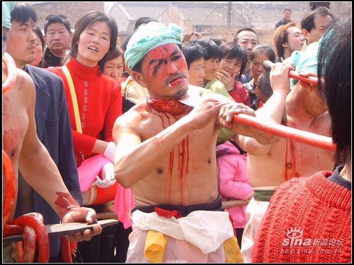 血故事,有严格的规定,严禁拍摄化妆、卸装场面。从村子人口中得知,他们大致多用家畜的血或者红的颜料涂抹在身上,用上特制的道具,跟魔术似的,如叉脖子、刺眼、断臂、刀劈脸,一般不得而知,逼真生动,又给故事平添了几分神秘色彩。