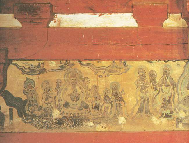 佛光寺创建于北魏孝文帝时期,是五台山西台外九大寺之一,隋唐之际,名震长安,受到唐王朝的重视。唐代会昌灭法时寺院被毁,后由高僧愿诚在施主京都女弟子宁公遇的捐助下于唐大中十一年(857)重建。东大殿是寺内的主殿,面宽七间,进深八椽,单檐庑殿顶,是中国现存唐代木结构建筑的代表作。按唐代佛寺有绘制壁画的习俗,佛光寺的重建得到的京城施主的捐助,四壁应该都是绘有壁画的,只是明代时寺内僧人重砌檐墙,在四壁塑造五百罗汉,可能这时将壁画毁掉了,现在只在殿内的拱眼壁和明间的佛座背后保存有零星的大小不一的22幅。拱眼壁是两个柱头斗拱之间的空档,绘有壁画的拱眼壁长450厘米,高66厘米。壁画的构图分为三组,中间的一组是说法图,主像是佛祖在说法,两侧是观音和势至菩萨,左右两组以文殊、普贤两菩萨为中心,各有胁侍菩萨和天王、飞天等簇拥,作赴会行进的状态,壁画的各端各绘有供养人,北边的一组是僧人装,南边的一组是俗人装,画幅虽然不大,却绘有众多人物,形象也十分生动,与敦煌石窟中同期的壁画相比较,设色绘法都完全一致。在绘制技巧上,以浓淡墨色虚实相映,用色以朱砂、石绿、土黄为主,有“焦墨淡彩”的唐画之风,画脸和胡须的笔法,尚存汉画的遗风,人物的衣着线条飘逸流畅,仍有传说中吴道子“衣带当风”的笔意,由于年代久远,画面的的颜色除赭土青绿外,均已变成暗褐色,失去了原有的艳丽色泽,但是更显得古朴苍老。