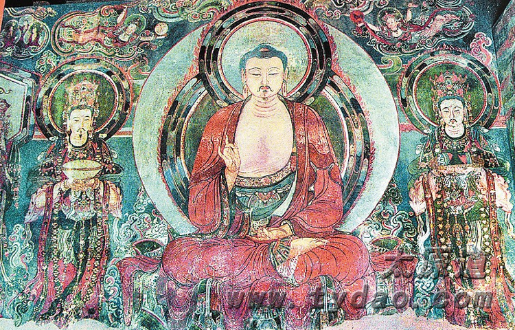 弥陀殿是供奉弥陀佛的大殿,面宽七间,进深八椽,规模宏伟。壁画分布于殿内四周,除后壁有部分损坏外,大多保存完好。壁面高5.73米,长约60米,保存完好者345平方米。东西两壁各画三组说法图,形式大同小异,都是佛坐中间,二菩萨侍立两旁,上画飞天。高大的佛像结跏趺坐在束腰莲台上,面容端庄慈祥,眼神微微下视,佛像顶天立地,巨大的气势摄人心魄,人物造型大气,颇具唐代遗风。南壁的西侧,画有千手千眼观音菩萨和其部属,南壁东尽间有画像六尊,分上下两排,上排是释迦、毗卢、药师三尊佛像,下排绘有妙吉祥、除盖障和地藏三菩萨,皆作坐式,沥粉贴金,金碧辉煌。北壁画佛、菩萨已残。壁画的布局沿袭着唐代壁画疏朗、雄浑的气势,与同时代壁画岩山寺壁画严谨的画风相比,有?然不同的风格。