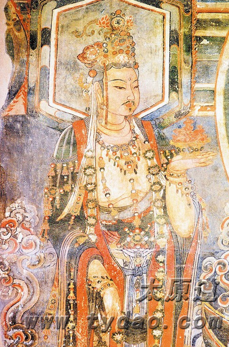 崇福寺壁画中的金代菩萨造型,形式多样,尤具功力。主像两侧的菩萨头戴花冠,精致富丽,服装饰物华美精致,飘带缠于膝下,手中或持莲花、或拿经卷、或捧宝瓶、或舞飘带,神情娴静自然,装饰华丽,犹存唐风。尤其是画有胡须的菩萨,尚存敦煌唐代造像的风格,尤为古朴,带有显著的北域风格。
