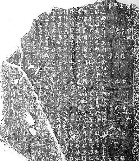这块古碑是由傅山的祖父傅霖撰文,叔祖父傅震书丹,叔祖父傅霈篆额,兄弟三人合作完成的一块古碑。古碑的发现。具有重要的文物历史价值:它是在傅山故里发现的、在同一块石碑上由傅山祖父傅霖、傅震、傅霈兄弟三人合作的唯一古碑,也是在傅山故里发现有傅震书法的唯一墨迹,康熙《阳曲县志·卷十四碑记》题为《崛(山围)重修龙王庙碑记》,古碑题为“山龙王庙记”。题目的第一个(崛)字缺失。古碑正文原有420个字,发现的残碑尚有357个字,缺失63个字。碑额篆文全部毁坏。