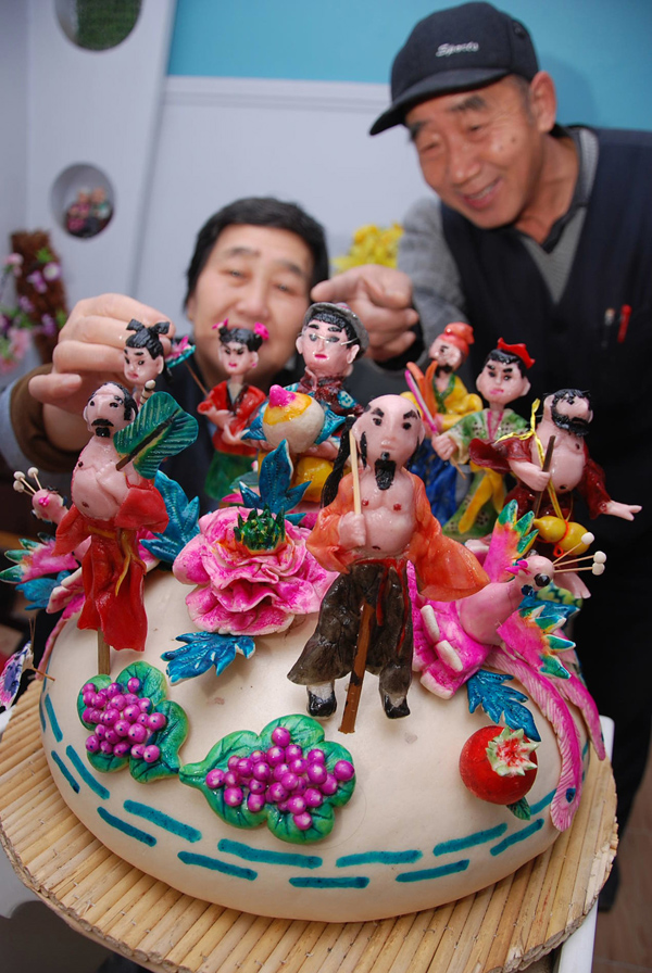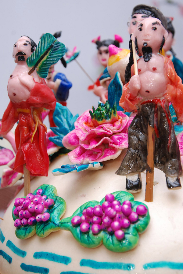 2009年12月21日,山西运城新绛县面塑传承人王文华在精心制作“八仙庆寿”面塑寿桃 |