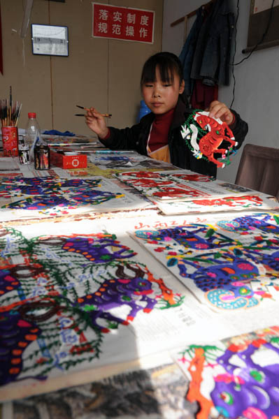 2011年10月31日,广灵剪纸文化艺术发展公司里的剪纸女工在为剪纸作品点染上色