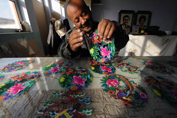 10月31日,广灵蕙花剪纸公司的剪纸师傅宋占林在展示刚刚完成的剪纸作品 |
