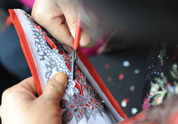 山西中阳剪纸的传承人王计汝在“山西吕梁中阳剪纸艺术展”上展示其作品