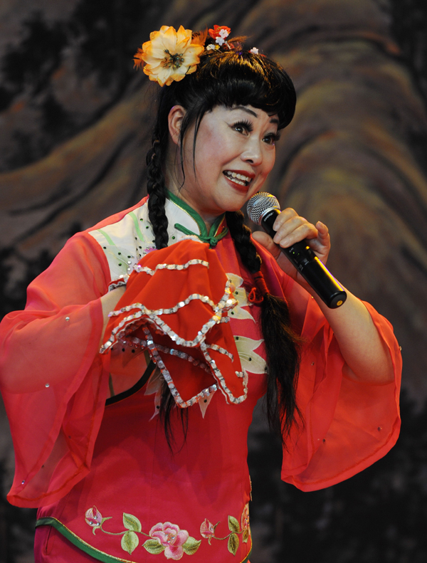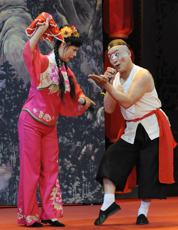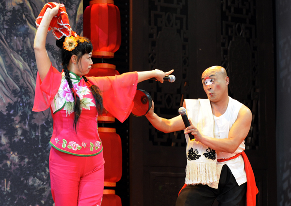 2010年5月21日,山西太谷秧歌艺术团的演员在宝钢大舞台展演区表演秧歌剧《卖高低》 |