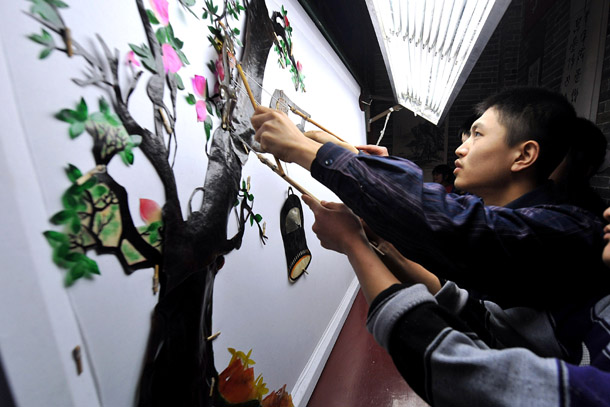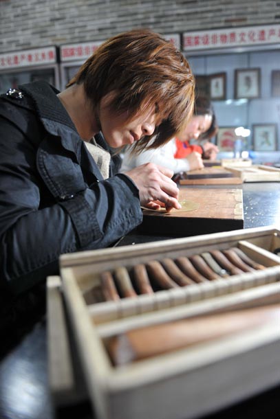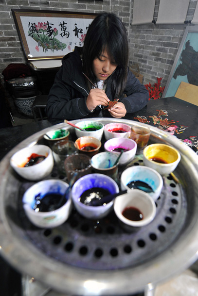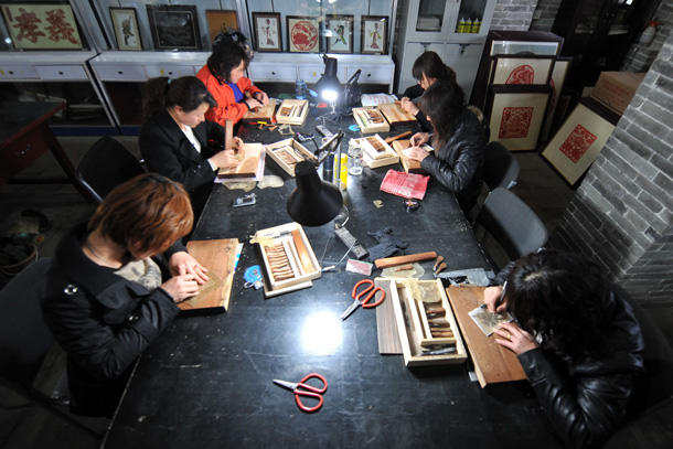 3月12日,在孝义文化产业皮影基地,皮影戏艺人在制作皮影
