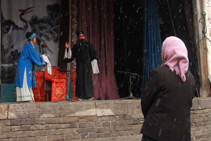冬日里在翼城乡村露天戏台演出的蒲剧演员