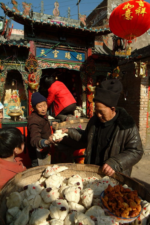 蒸好的面塑供品往盘子里摆是有一定讲究的,一般都要由有经验的老纠首来主持
