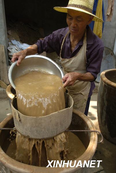 2007年7月17日,在山西省新绛县绛州澄泥砚研制所, 一名工人正在把采掘来的河泥用绢制的箩过滤,以滤出极为细致的澄泥