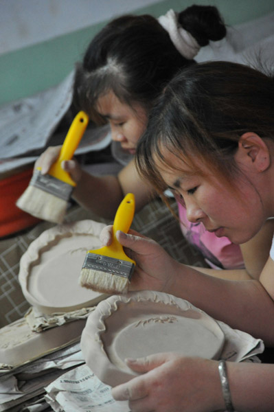2010年7月24日,工艺师在修饰绛州澄泥砚“和谐砚”(新华社发高新生摄)