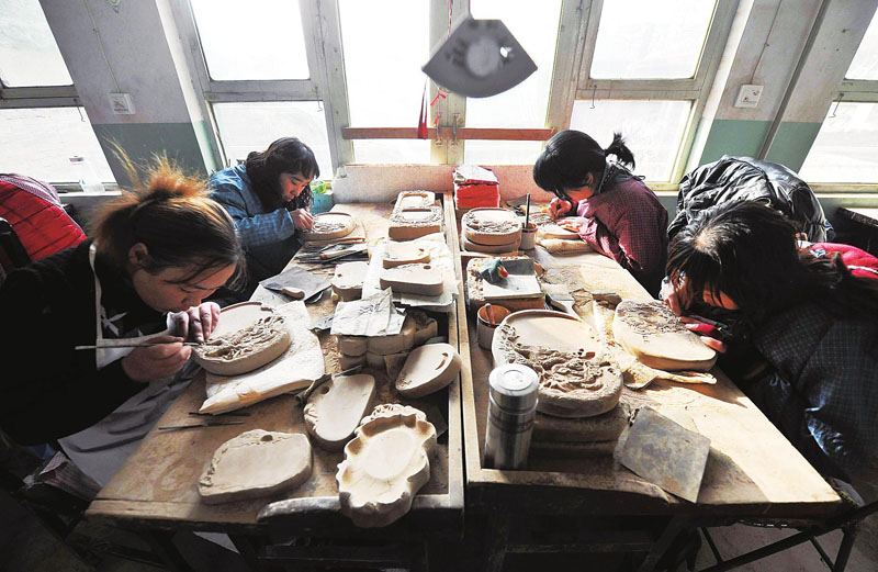 工艺师在修饰绛州澄泥砚“和谐砚”(新华社发高新生摄)