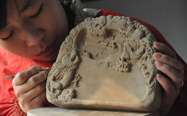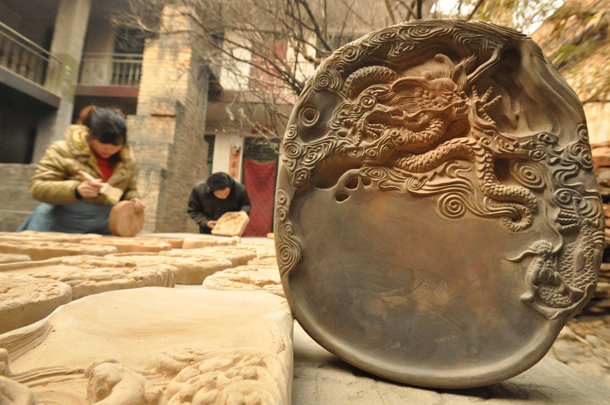 2011年12月29日,山西省新绛县绛州澄泥砚研制基地,一名制砚工艺师在修饰龙砚迎龙年