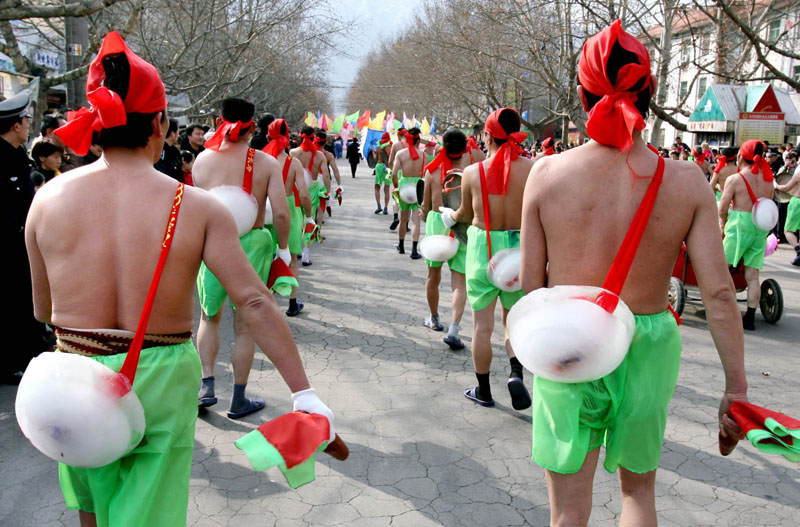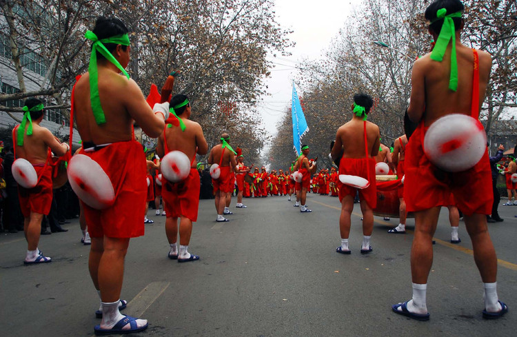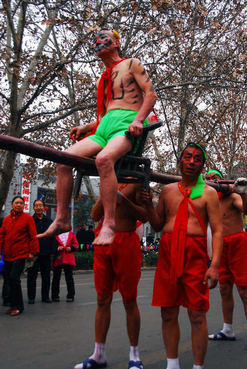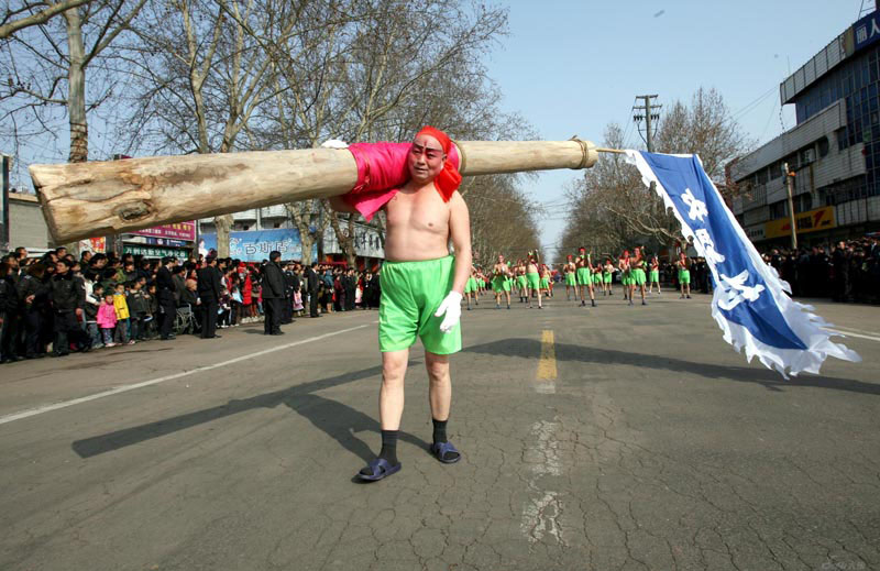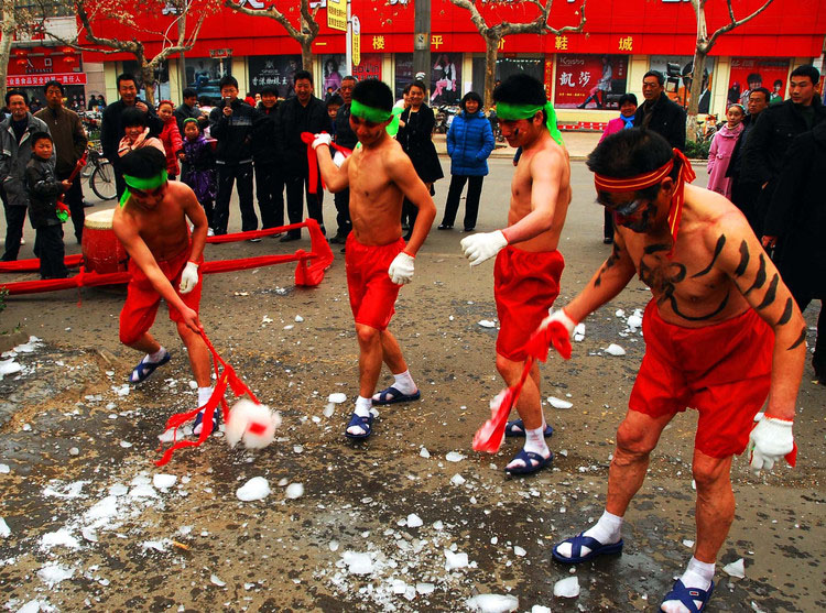 背冰俗称“亮膘”,是我省永济市长旺村在春节期间举办的一种民俗活动。在天寒地冻的环境下,一个个赤身裸背的男子,仅穿一件红色大裤衩,将一块约二寸厚的大冰块贴身背在脊背上,不断变换队形并进行表演。 关于这一习俗的渊源,当地有两种说法,一种为:相传清朝咸丰年间,洪秀全领导的太平军北征攻打蒲津渡时,满清守城将领夏新有下令拆了千户民房,架起了一道木城墙,木城墙上涂满了油,当太平军攻城时,清军就用火点着木城墙,太平军屡攻不破。太平军部将相福录是长旺村人,他提出让大家下黄河凿冰,然后背冰块灭火破城,果然大告成功。相福录解甲归田后,在本村组织民众再现当时背冰的情景,展示农民起义军勇敢、大无畏的气概。另一种为:北伐的太平军遇到险情,前有清军的火龙阵阻挡,后有追兵逼近,在这种危急的情况下,长旺村的村民相福录自告奋勇,率领200名精兵,化装成绵羊,将冰块投入火阵,为北伐的太平军打开了通路。后人为纪念农民起义军的壮举,每逢正月十五前后,都要举办“背冰”活动。最初是在脖子上套一个冰圈,在锣鼓声中昂然挺立,显示不畏严寒的气概,以后发展变化为背铡刀,再后来又发展为赤身背大块的冰凌绕村而行。 在背冰活动开始前先有一段小小的插曲,被当地百姓称为“逗社火”。大清早,一群10岁左右的黄河娃在大人的安排下,手敲锣鼓,怀抱公鸡,到各“社火头”家门前去耍闹,目的是督促“社火头”赶快带领大家闹“社火”。逗社火过后,就会看到一支由一名大汉扛着木檀大旗的队伍,接着五六支队伍相继接踵而来,较大的队伍在木檀大旗后面有铳队、龙虎牌、背花锣鼓队、背冰手,排在最后的是一座精致的 花轿,坐轿人煞是威风。这些社火队伍在村口一片空地集中后组成大型社火队,开始游街串巷表演,领头人肩扛木檀大旗,身背闪亮的大铡刀,威风凛凛,势不可挡。经过一个多小时的行进,背冰人终于抵达了胜利的“彼岸”,把身上的冰块重重地摔在地上,预示着“背冰穿越火墙”的成功。 整个过程一般持续三四小时。这支队伍组成八卦阵的队形,踏着鼓点,不断地变换队形并进行表演。“背冰”的主要表演动作有下河、破冰、匍匐前进、刀枪不入等动作。“下河”就是双手举起,双腿弯曲,左右弹跳踩动;“破冰”就是左右斜着上下舞动,左右弓步轮流倒换等形似农民锄地的动作;“匍匐前进”是单手撑地,右手“撇”打,形似动物爬行;“刀枪不入”是行进间的步伐,昂首挺胸,右手“撇锣”,动作和脚下的步伐整齐划一。整个活动的伴奏乐器“背花锣鼓”可谓别具一格,它既是伴奏乐器又是表演者手中的道具,当地人称它为“撇锣”,一根树枝扎绑在“锣”手后腰间,从脑后向上弯至头顶伸向脸前上方,大锣吊在树枝上,树枝上点缀着手工艺花和一面圆镜,“锣手”左手抓锣沿,右手“撇”锤,上下“撇”“敲”。一组表演队伍的伴奏乐器由四面锣一面鼓组成,鼓点名称为“四鼓点”。 背冰受到当地群众的欢迎,得到人们的自发传承,成为春节期间代表性的风俗活动,用长旺村人的话说是“敲一年锣鼓背一次冰,今年肯定好收成”。背冰这一活动在演技上没有太大的难度,但却是在一年中最冷的时候进行,是对男性体质、力量、抵抗寒冷及意志能力的严峻考验。长旺村家家户户都要出人参与,或背冰,或背着家中最锋利的兵器,比如铡刀、大刀等,在刺骨严寒中展示着威武,通过参与这一活动,鼓励民众在任何恶劣的环境下都要有战胜困难的勇气和决心。 ■ |