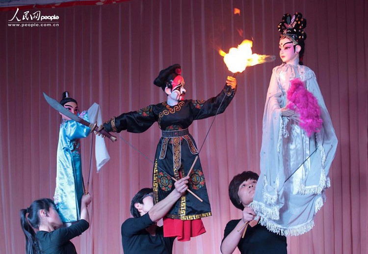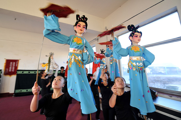 孝义木偶戏艺人在表演木偶长绸舞《霜月婵娟》