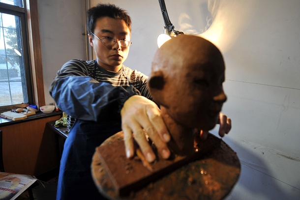孝义木偶戏艺人在制作木偶泥胚
