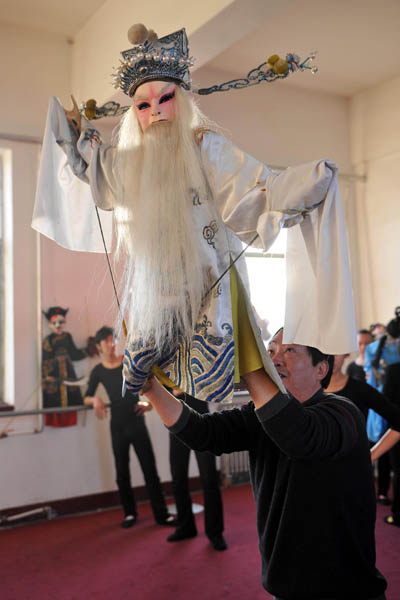 孝义木偶戏艺人在整理演出道具