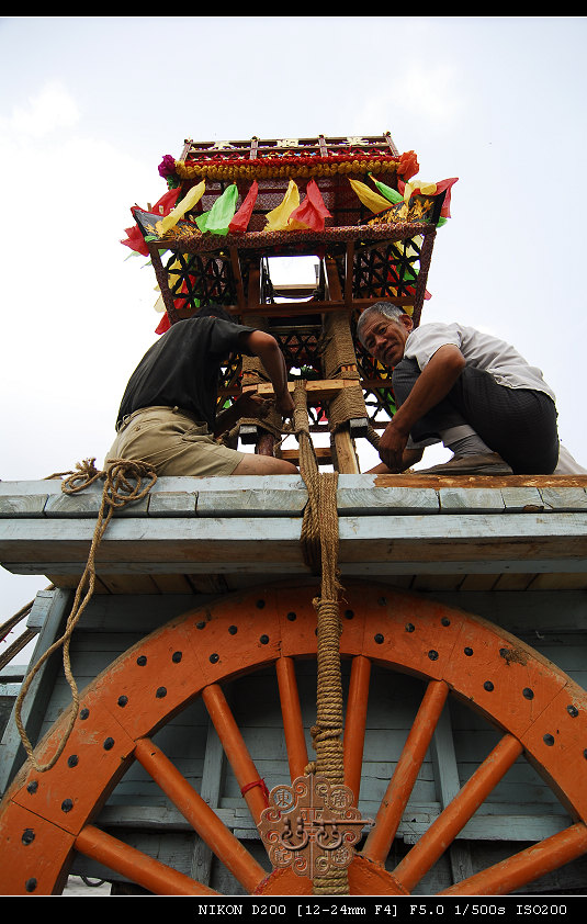 所谓四景,一是一根独木辕套两头大健牛;二是用一根牛角杆和三个木犋环环相套承驾辕头;三是第二节的主木构架,不用卯不开榫直立在底平板上,用麻绳上下捆扎紧固;四是第二节主木构架上端和第三节主木构架下端相接点,不用卯不开榫,而是四条麻绳上下捆扎固定。车的动力除两只辕牛和两只梢牛拉拽外,前面用两根直径约5厘米的麻绳由近百名粗壮劳力拉拽,车后和车左右还备有4根牵绳,以防车体歪闪倾倒。过去,四景车从东河九天圣母庙到主会场(圆心地)相距约5公里,中间还要经过约50米、45度的土坡,其路程之远,坡度之大给跑车带来一定的难度。但据百岁老人回忆,从来没有听人说过在历年大赛会中发生过翻车事故。由于四景奇特,沿途观者甚多,是否参加过大赛会、是否观看过四景车,成为当地人的一种资历,一种荣耀。所以,至今民间仍流传“赶了大赛会,死了不后悔”的谚语。