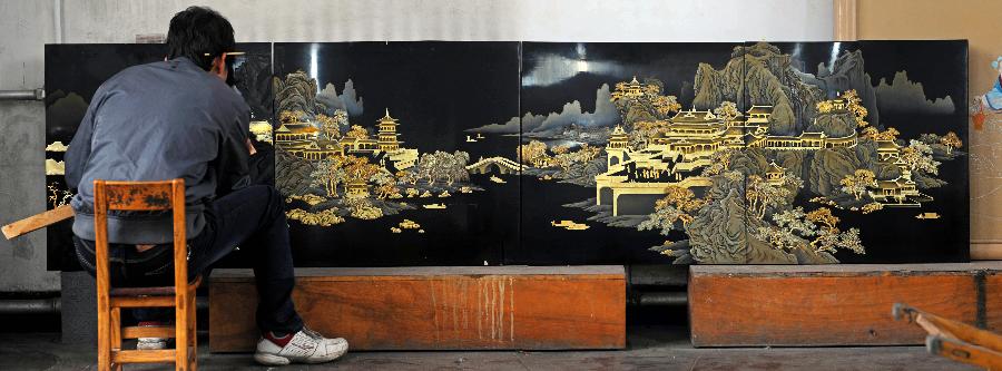 平遥漆艺传承人薛生金的弟子张勇兴为一幅漆画上色