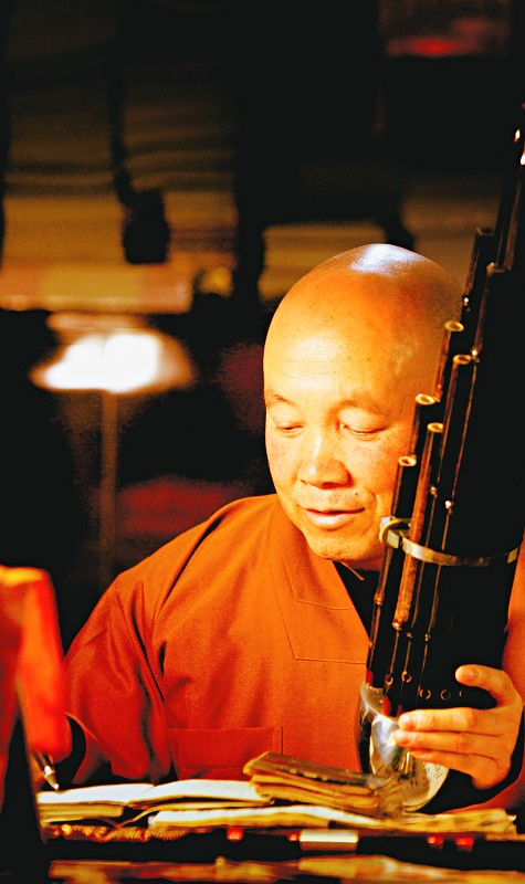 中国的佛教音乐分为南北两派,南方佛乐以委婉、清秀为特点;北方佛乐则深受古印度音乐的影响,呈现古朴、典雅、庄重和肃穆的特点。 五台山是全国惟一兼有汉传佛教和藏传佛教的佛教圣地。佛教音乐与五台山佛教相伴,是五台山佛教文化的重要组成部分。演变作为北方佛乐的代表,五台山佛乐与五台山佛教同生共荣。 五台山佛乐源于印度佛教音乐。唐代,由于佛教仪式的日益集体化、规范化,五台山佛乐达到繁盛,形成独唱、齐唱、轮唱等多种演唱形式。 元末明初,乐器被引入五台山佛教,除为经文诵咏伴奏外,还要演奏乐曲,使五台山佛教仪式的艺术性得到很大提升。到了明代,五台山佛乐又有新的发展,进一步吸收了唐宋曲牌、元杂剧曲牌以及民歌、民间乐曲等的特点。清康熙以来,由于统治者特别青睐藏传佛教—— 喇嘛教,五台山佛教音乐中便又出现了黄教音乐。 目前,僧人掌握了演奏技巧的五台山佛乐有20多首,在法事活动中常用的有《华严会》、《普庵咒》、《千声佛》等。 随着时代的发展和变迁,五台山佛乐也在发生着变化。新一代僧人已开始学习简谱和西方的乐理。同时,一些新编的佛乐则采纳了不少当代流行歌曲的乐谱。一些香客认为,这样的佛乐更易上口,也容易深入人心。分类 五台山佛教音乐,分为经文音乐和经外音乐两部分。 经文音乐是专门用于佛事活动的音乐,由经文与佛曲相融而成。没有乐器伴奏的称“咏读”或“念高调”,有乐器伴奏、以歌赞为主的称为“梵呗”或“合念”。经文音乐主要有四种形式:一种是带有乐器和法器伴奏的唱经,僧人们称其为“和(音格)念”;第二种是不带伴奏、只用法器击节的唱经,僧人们称其为“令调”;第三种是有简单旋律线条的“吟诵”;第四种是以语言自然音调为基础、和着木鱼敲击节奏的“诵经”,僧人们称其为“直数”。 经外音乐没有词、偈,仅有以乐器演奏为主的器乐曲牌,是五台山庙堂音乐的精华。 传承 五台山佛教音乐的传承方式是传统的口传心授。学习时,徒弟首先要把乐器上每个字的位置记牢,然后学习唱谱。学习唱谱时,师傅首先依照工尺谱(中国民间传统记谱法之一,因用工、尺等字记写唱名而得名)所提供的曲调框架,按照自己的理解或是个人的爱好和习惯,依据板眼一句一句施教,待徒弟唱会并背下来之后,再拿乐器依字找音(俗称“捏眼”),慢慢奏出旋律。每一首乐曲的每一句都需要这样去教。所以,如果没有师傅的传授,徒弟仅有乐谱也是唱不出曲调的。这种教授方式,使每一首乐曲旋律由于师傅的不同而产生些微的差异,,同时,也形成了相同曲调有多种不同唱法的现象,使乐曲显得非常丰富。但是,无论怎样变化,曲调的基本风格不会变。五台山僧人在点笙(调音)方面有独特的技艺。 但是,五台山佛乐的不断萎缩十分令人担忧,主要表现在以下几个方面。一是,以前,五台山的一个寺院就可以组织起若干僧人组成一支相当规模的乐队来演奏佛曲,但是现在一个寺院如果想要做一次传统佛事,需要由几个寺院共同凑人,才能组成一支小规模的乐队。二是,在一部清宣统二年曲谱的抄本中,记有曲调200多首,而目前青、黄庙恢复的曲目仅二三十首。造成这种现状的主要原因是传承的困难。目前,五台山上会佛乐的僧人不过50余位。培养一个能演奏乐器并会唱经的僧人要几年甚至十几年的时间,而训练班里的僧人流动性很强 。继承五台山佛乐文化遗产,需要一份恒心。如何更好地传承这份文化遗产,是一个刻不容缓的课题。 ■