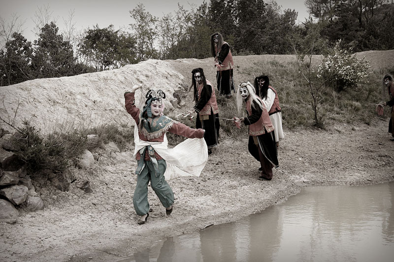 五鬼盘叉,亦名“小鬼捉刘氏”,是我省晋城市陵川县六泉乡(原冶头乡)赵豁池村独有的具有古老故事情节的一种舞蹈。因有五名表演者扮演小鬼且持叉表演,所以被称为“五鬼盘叉”。 五鬼盘叉来源于一个传说:古时有一位刘氏,虐待公婆,作恶多端。人们认为她罪孽深重,必有报应。“阴间地府”判定刘氏阳寿已终。于是小阎王带领五个小鬼来捉拿刘氏,先找到地方(土地爷),领着众小鬼来到刘氏家。奉阎王之命捉拿一贯打骂公婆、欺侮邻里、作恶多端的刘氏。众小鬼在地方(土地爷)的带领下,找到刘氏并与其展开搏斗。刘氏则四下逃窜、躲藏,虽撒泼抵抗,但最终被五个小鬼叉于空中,拿回阴间。舞蹈就表现了这一传说内容。小阎王、众小鬼、地方、刘氏是舞蹈中的主要人物。“五鬼盘叉”完全以舞蹈形式表现,该舞蹈的每个动作都具有鲜明的性格特征。小阎王带领众小鬼旋风似地绕场,融民间舞蹈、武术、戏曲动作为一体;众小鬼既有“吸腿、跳转、扑步”等基础性动作,又有“烤火、磕转、迈顶”等单一的个性动作;刘氏不仅有“虎跳、跌叉、吃叉”等技巧性动作,还有手握叉前翻360度的高难度动作;特别是小阎王的 “足尖步”,五趾着地,左右颠拐,飘忽不定,更增加了神秘色彩。当五个小鬼用钢叉将刘氏托于空中时,更使人望而生畏。 “五鬼盘叉”于每年正月初四,民间俗称的“接香会客”时在本村佛爷庙门外的广场上表演。此外,还在农历六月初一、初六赶庙会时,到邻村去表演。民间叫“行香走会”。在整个表演中,乐队始终视演员情绪变化急缓有致地伴奏。表演者既在音乐之中,却又不受节奏约束,然而动作又十分协调默契。对于晋城市陵川县冶头乡赵活池村的村民来说,“五鬼盘叉”是全村老少皆知。全村是一个大家族,都姓赵。村里的年长者说:从光绪年间,祖辈由洪洞大槐树迁徙到此,此舞就世代传习,流传至今。 “五鬼盘叉”只用打击乐伴奏。乐器有大墩鼓三面;大镲六付;铜锣十二面。乐队共需27人,其中抬大墩鼓者6人。行进时仪仗队先导,后跟乐队,共分为三组,每组打击乐均为:前排拍镲者居中,左、右各一击锣者;中排两人抬大墩鼓,一人敲;后排拍镲者居中,左、右各一击锣者。队列次序是:先为第一组打击乐,然后是四名耍三股叉的小鬼,接着是第二组打击乐,后边紧跟另一小鬼及刘氏、小阎王、地方(土地爷),最后是第三组打击乐。在场地表演时,三面鼓成一排,由一鼓指挥;六副镲围鼓成半圆形;十二面锣站在外圈。其锣鼓点较简单,锣与镲打相同节奏,唯鼓点略为花哨,但重音与锣镲相同。音乐伴奏与舞蹈只做大体配合,烘托情绪,不求节拍吻合。除开始和结尾外,只有一个常用鼓点连续演奏起来能造成急促、紧张、阴森而有几分恐怖的气氛。 当地村民在表演“五鬼盘叉”前素有跪拜祭叉的习惯。表演时以打击乐伴奏,并燃放鞭炮加助气氛,只舞不唱,整个舞蹈在打、逗、闹中渲染气氛。表演题材取材于传说,意在劝人弃恶从善。 ■ |