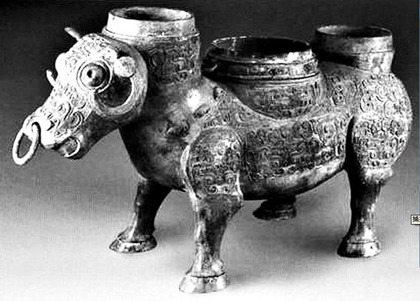 中国青铜器的艺术成就,有两个高峰。第一个高峰出现在商代,第二个出现在春秋战国。这只牺尊,是一个牛形酒容器,属于中国青铜器第二个高峰期的杰作。高33.7厘米,长58.7厘米,张口、鼻穿环、两耳直立、两角成弧形向前。颈、背、臀部各有一圆孔,牛腹中空。此造型,在中国青铜器中绝无仅有。牺尊的纹饰也很别致,既有兽面纹,也有动物纹,这在中国古代青铜器中也比较少见。