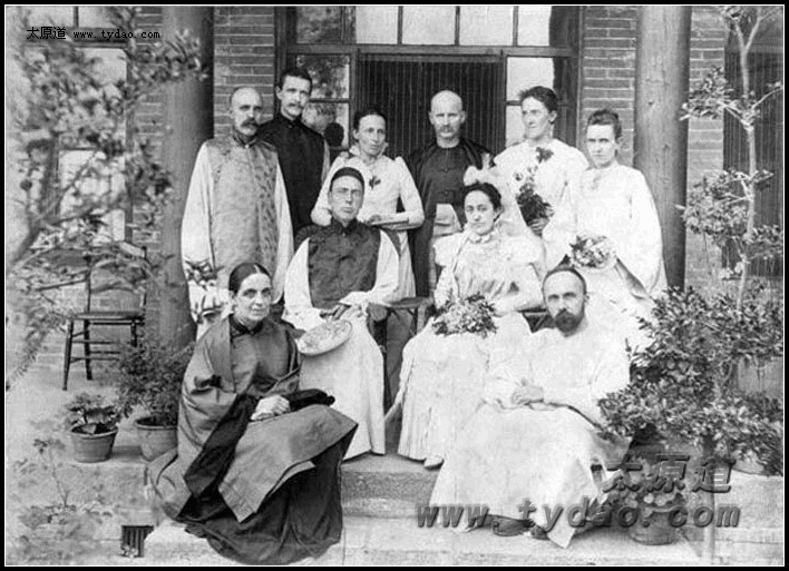 Ernest Atwater与Elizabeth Graham(第二排,1900年8月15日在汾州夫妇同时被杀)的婚礼,台阶最前就坐的是英国浸信会的Edwards夫妇,在新婚夫妇身后的是(左至右):George Williams(1900年7月31日在太谷被杀),Underwood,Alice Williams,Howard Clapp(1900年7月31日在太谷被杀),Louise Partridge(1900年7月31日在太谷被杀),George Farthing牧师的家庭教师Ellen Stewart |