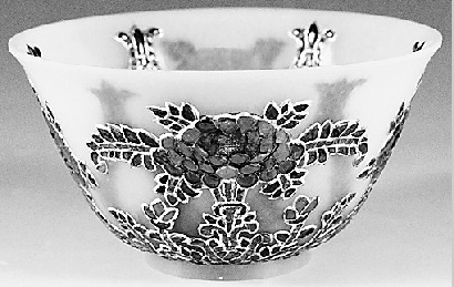 中国玉器,自东汉以后就逐渐摆脱了神秘色彩而向世俗转化。后来的生活用玉逐渐多了起来,明清时达到了鼎盛,并成为玉器制造的主流。上流社会用以享受生活并显示富贵,它不仅装点丰富着人们的追求,而且蕴涵其间的生活情趣和审美意识也折射出制作者对艺术的追求。这件是清代乾隆时期的白玉嵌宝石描金碗,玉呈青白色,碗腹为花草绿叶相拥的宝相花图案,内壁为六组石榴纹,图案为先施底色,然后由无色透明碎宝石堆贴,描金而成。碗形仿痕都斯坦玉器的风格(按:即伊斯兰风格的玉器,当时称为“痕都斯坦玉器”;痕都斯坦,南亚古国名),式样新颖,制作精美,代表了当时玉描金和嵌宝石的高超工艺水平,也是当时乾隆非常钟爱的一种装饰技法。