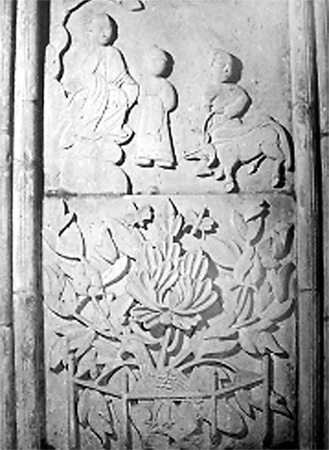 金代墓葬砖雕,往往多有表现百姓喜闻乐见的爱情故事的题材。这块出土于稷山县马村4号墓的牛郎织女天河会砖雕,长75厘米,高126厘米,画面上栏为牛郎织女图,其左侧树下织女脚踏祥云,身侧侍从手执巾帕;右侧牛郎挽袖执缰牵牛,其下刻细微的水波纹,意为天河。牛郎织女的故事是一个流传于中国民间两千多年的美丽的爱情故事,传说织女本是天帝的女儿,他爱上凡人牛郎,于是下凡与牛郎结合,后被王母发现,强迫二人分开,还用星辰组成的“天河”隔绝两人,只允许每年的七月初七夜晚由喜鹊架成的鹊桥才能相见一次,这段凄美的爱情故事流传在中国民间,每年农历的七月初七被称为“七夕”,今天已成为中国的“情人节”。