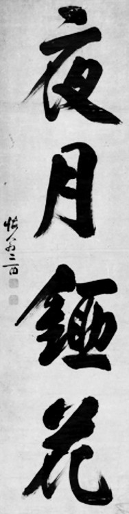 杨二酉是清代山西又一书法大家,他的书法作品意境高迈,天趣流动,以颜真卿笔法为基调,参以二王笔意,深沉中极备灵动之致,凝炼雄浑,意态雍容,具见其非凡的功力。现展出于山西博物院“山右清风——山西清代名家书画展”的杨二酉书法,有一套气魄非凡、极其精彩的杨二酉行书《后赤壁赋》十二条屏,限于篇幅,这里介绍他的另一套作品——杨二酉行书联。这套对联为纸本,每幅画心高173厘米,宽46厘米,上联书“晴窗听鸟”,下联书“夜月锄花”,落款“悔翁二酉”,笔力遒劲,气势雄浑,极见功力,是杨二酉传世不多的真书墨宝。