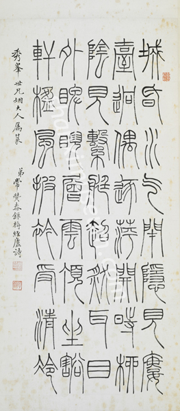 “山右清风——山西清代名家书画展”的常赞春篆书王轩诗轴,可称是常氏的代表作品之一。作品为纸本,画心高1.297米,宽0.825米,释文为:“城昏水气闭,隐见楼台迥。偶逐萍开时,柳荫见系艇。超然耳目外,睥睨层云顶。坐豁轩楹风,披衿受清冷。”落款为:“秀峰世兄姻大人属篆,弟常赞春录槈经庐诗”,字体古奥刚劲,又不失清代书家气韵流畅的特色,可谓篆书精品。