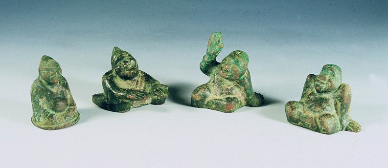 俳优,是一种比较原始的有俳谐性质的综合技艺表演者,包括乐舞、杂技、滑稽等多种技艺。先秦时期,俳优多为侏儒,他们作为奴隶从事这一“调戏为事”的职业。两汉的俳优身份依然低微,但除了侏儒外,还有一般人也加入到这个行业中来,他们几乎全为男性,上身赤裸,身体肥胖,面目丑陋,表情夸张。我们现在看到的这四件铜俑镇也有这些特征。两汉时期,娱乐内容大大丰富,俳优受到社会各阶层的欢迎。文献中关于俳优的内容很多,但是俳优的具体情状如何却不得而知。考古发现弥补了文献记载的不足,山西博物院展出的这四件俳优铜俑镇为探究两汉时期的社会娱乐生活增加了材料。