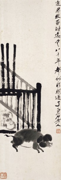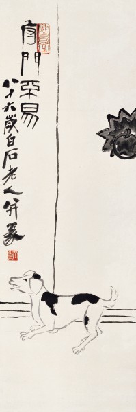 之前中国画对兽类的描绘,从未有过齐白石这样大胆的尝试,近似“漫画化”的笔法又实则确属中国画范畴,这一只墨猪、一只墨狗,憨态中似乎带着笑容,表达了画家对生活的热爱和对故乡的怀恋。寥寥几笔,形态俱现,将很少出现在中国画题材里的农家畜类也描摹得令人喜爱不已,深深地融进齐白石的乡情之中。在齐白石的笔下,“情”与“趣”往往难分,一脉难以泯灭的童真、童趣几乎伴随画家走完九十多年的人生,胸无尘滓,心无挂碍,是齐白石笔墨的最大特点,也正是齐白石不同于其他画家的根本之处。