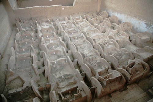 已被泥土和岁月侵蚀的车铃依稀还在,车轴上雕刻精细的青铜轴盖上饕餮兽面纹仍大张着嘴巴,马鞭静静躺在角落里,车辕上连接战马的皮制缰绳也无声诉说当年情景,一墙之隔的战马似乎还在等待谁给它套上缰绳……