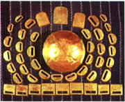 装有金器的木匣长40厘米、宽25厘米、高30厘米,多年的风化,木匣已腐蚀成了纤维状。西端放着扁圆形金片和金铤,金铤交替四层叠压在一起;东端放金箔三捆;在金铤、金箔之间放着金饰、金链和官服腰带上的金銙等,全部共有193件,合计总重为34810克,折合成纯金重量为33025.64克,且含金量竟在95%以上。