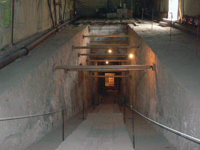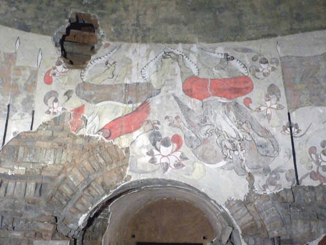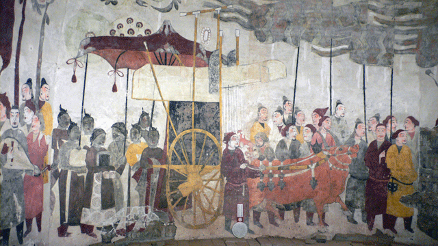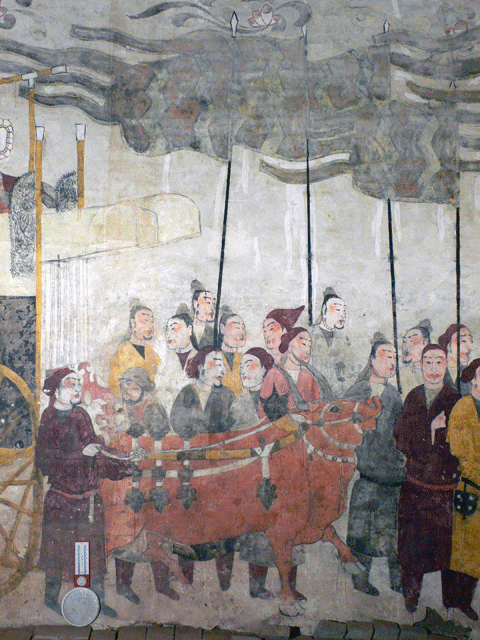 仪卫队列至墓道下底端,过第一道封门砖墙进入天井,两侧壁面的队列仍在延续,穿越门宅式石雕墓门、砖筑甬道,再过一道封门砖墙,就是期盼已久的墓室。墓门两侧正壁绘制神态谦卑的执鞭门吏,石门彩色贴金雕饰华丽无比,宗教意味浓重,神鸟怪兽、摩尼宝珠、莲花蔓草使人惊叹不已。时间一天天过去,人们受好奇心驱使,对揭露墓室充满期盼。