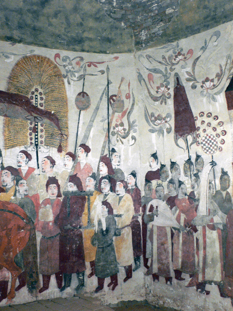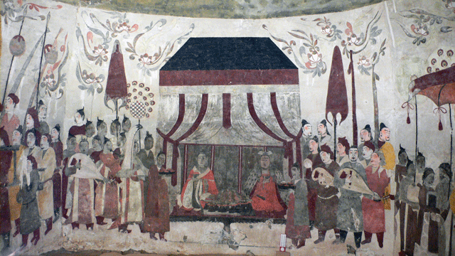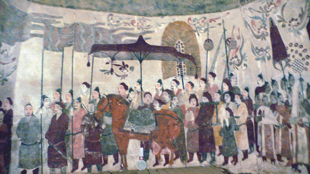 考古工作已经连续进行两年多了,又是一年金秋时节,2002年国庆节期间,墓室封门砖终于启开,欢呼之后,人们看到:布满繁星的浅灰色穹窿下,墓主夫妇背倚屏风端坐在暖帐之下,袍服裘衣,面容祥和,举杯共饮,两侧男女伎乐环伺;西东两壁夫妇二人的车驾都已备好,青壮年前导与随从瞻前顾后、各司其职。人物无论男女都红粉妆面,清丽俊雅,前后错置排列,层次分明,在画面补白处则布设硕大的莲花、彩旗、冠盖、羽葆和长戟,墓室南壁上方依然是两个红裤方相氏,怒目圆张,似乎要飞出门外。墓葬底面散置棺板、陶俑和瓷器等。由于多次被盗,随葬品大多不复原位、破碎不堪。通过进一步整理,墓葬出土残存陶俑、瓷器、金银器等约500件。其中的辫发陶俑、镌刻着武士形象的金戒指都是不可多得的珍品。砖砌棺床与墓室南壁之间存一方青石墓志,根据志文得知墓主徐显秀,武平二年(571)70岁时卒于晋阳,忠义郡(今河北)人,先投奔尔朱荣,后追随高欢,逐步升迁,北齐时功封武安王,历任徐州刺史、大行台尚书右仆射,拜司空公,迁太尉。由此,不禁想到娄睿和娄睿墓。
