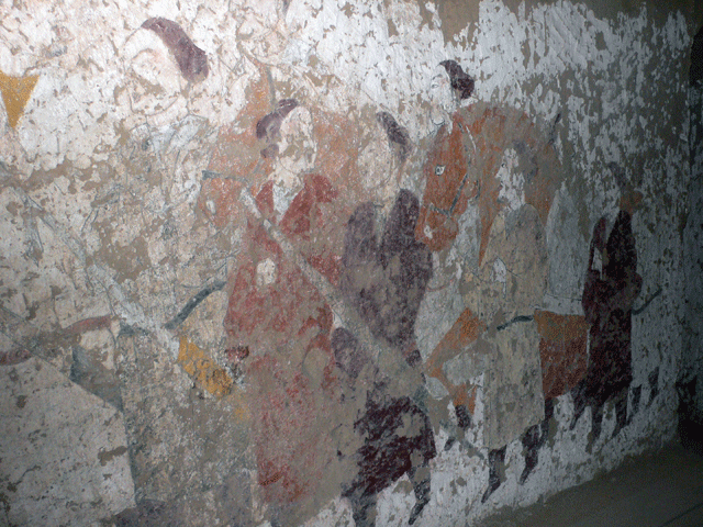 正值隆冬,疾风卷过衰草秃树,寒气逼人,考古队开进工地后,冻结的土地倾刻间氤氲起滚滚热潮,西北风呼啸着似乎从树梢间退缩隐去,考古工作在恶劣的气候条件下逐步展开。经过勘探得知,墓葬坐北朝南,平面呈“甲”字形结构。清理上层表土后,由墓道上口逐层下挖,露出白灰口线后,发掘工作随即变得谨小慎微、宁神静气起来,很快,意料中的墓道壁画一分一毫地显露出来,它艳丽无比,却极易剥落,原因是壁画白灰浆底稀薄脆弱,加之外界干扰,空气渗入和草木根系作用,使之与土壁分离,白灰浆层进而掉落而使画面产生缺失。形势十分严峻,来不及辨认绘画内容就立刻投入到壁画保护中,为维护壁画的安全性和完整性,工作人员投入最大的耐心、细心和责任心,像母亲呵护婴孩,又像绣花姑娘的一针一线,夜以继日地,历经二百多个日夜,墓道壁画终于清理完成。沿着斜坡墓道缓缓而下,墓道口憨态可掬的方相氏故作狰狞,大红的裤子、锋利的爪牙,其后则是行进中三五成群的卫队,人物大小与真人相仿,头裹帻巾,身着袍服,手持长戟、彩旗,面颊红润、须发毕现,形神兼具,威风凛凛。