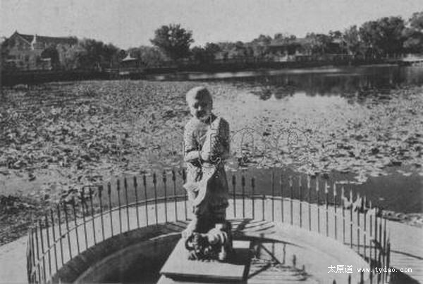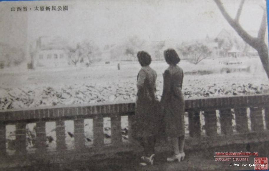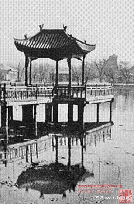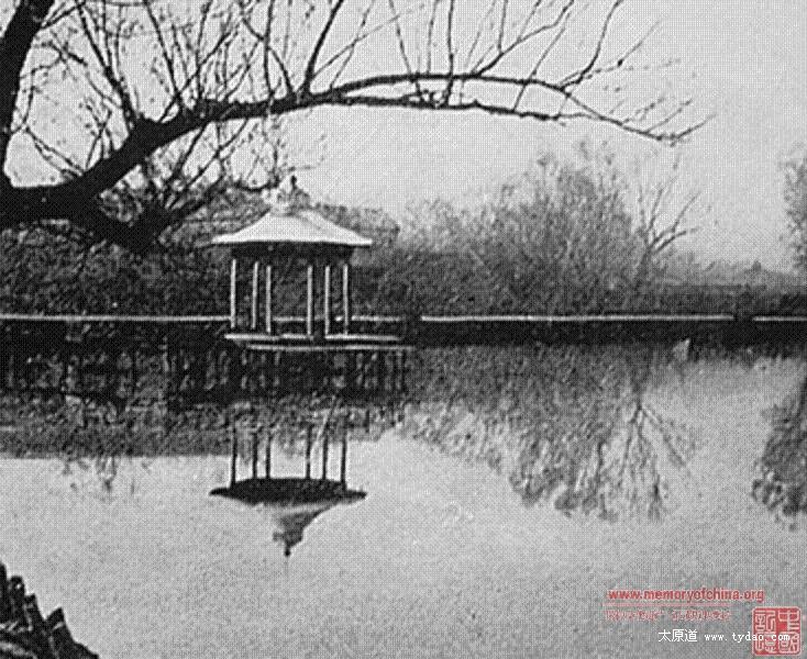 新民公园,即文瀛公园、中山公园,照片拍摄的是文瀛湖中的扇形水亭, 连曲桥与湖岸相接,人们叫它“水阁凉亭”,是当时园里一处大型景观建筑,日伪时期倒塌