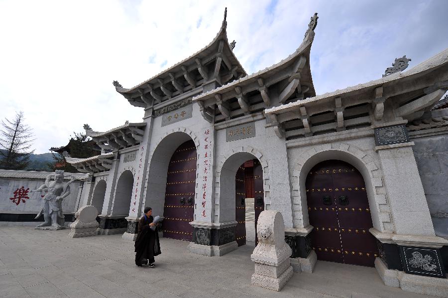 2012年8月25日,五台山普寿寺尼众佛学院的尼众从念佛堂前走过