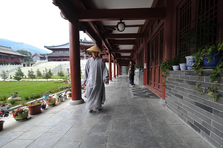 8月25日,五台山普寿寺尼众佛学院的尼众走在佛学院里