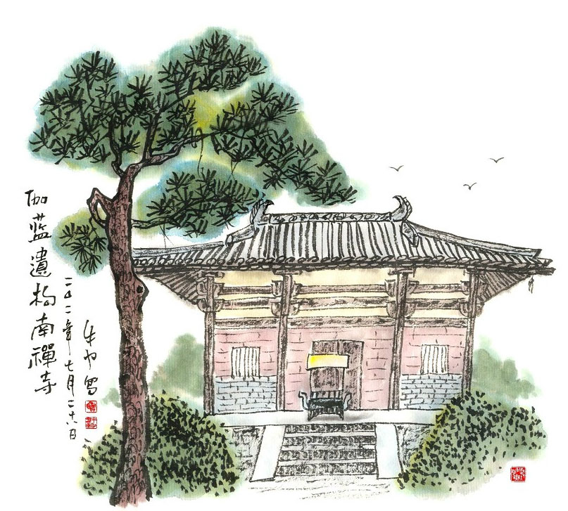 沿着乡间小路爬坡北上,路两旁是葱翠的松林、果园和庄稼,置身其中,脱俗之感油然而生。就在这样的情境中南禅寺出现在眼前:寺坐北朝南,位于坡顶一片开阔地上。寺院正前方是一条很深的沟壑,沟内松树高大挺拔,与寺前后的树木呼应,将红墙碧瓦的南禅寺围拢起来。
