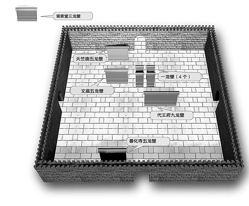 一龙壁4座、三龙壁1座、五龙壁3座、九龙壁1座,另有1座早已不存的七龙琉璃壁——像大同这样世所罕见地将如此众多的龙壁集于一地者,谁敢不承认它是当之无愧的“龙壁之城”呢?