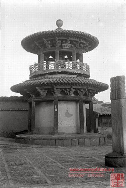 钟楼、鼓楼为圆形穹庐形,整个建筑分上下两层,周设八根廊柱,下层砌墙成圆形内室,墙中又置八根老柱直通上层,变为檐柱,支撑楼顶梁架。上层开敞,周有平座围栏,瓦顶上置圆形宝顶,上下层斗拱均为五踩。钟楼上悬铁钟一口,重四百余公斤,铸于明宣德七年(1432年),质地优良,音色洪亮,击之钟声可达数十里之遥。钟上铸有梵文,“佛字”及八卦图。