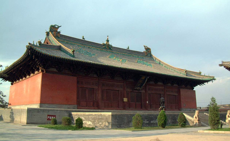 殿顶上,殿脊上有两个形制相同的琉璃武士,殿外九脊全为瓦条砌垒,殿顶上筒坂布瓦覆盖,绿色琉璃和脊饰剪边。两个高大邸吻矗立正脊之上,乃金代原物,高1.5米,近似真人,是我国辽金建筑中最高最大的脊刹琉璃武士,其造型与工艺精湛,色彩艳丽,堪称上乘佳品。正脊中间置有瓦楼一座,将军居中,神志昂扬。