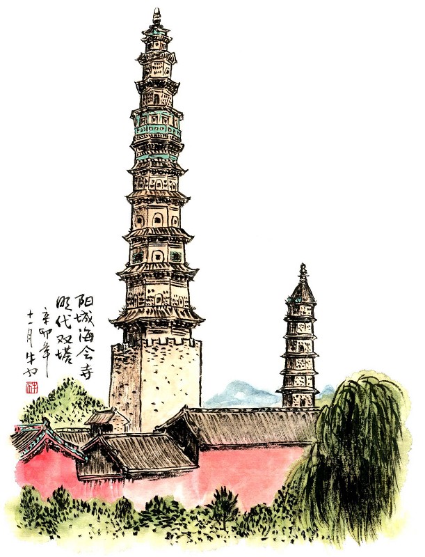 “东有苇顶的阁,西有海会寺的塔。”张升奇所说的苇顶,是距大桥村不远山上的一个村子。“阁”是何模样,至今已不可考,但海会寺别院双塔别致造型堪称国内一绝。
