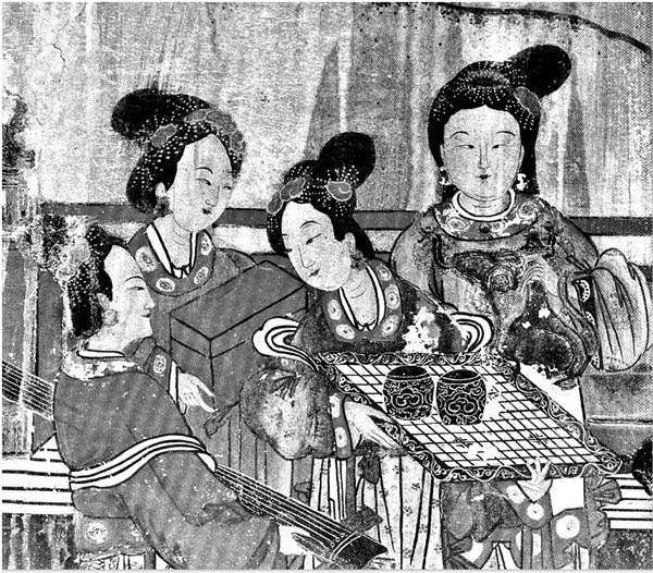 圣母殿神龛后还绘有描绘圣母宫中生活的壁画。其中两幅上五位女乐师分别持琵琶、笙、笛等乐器正在演奏乐曲,另外两幅上的侍女分别捧宝盒、典籍、食盒等侍奉在圣母身边。
